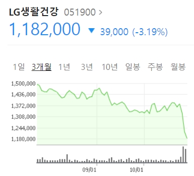 LG생활건강이 실적 발표 후 장중 -4%가 폭락했습니다. 안 그래도 고점 대비, 주가가 많이 하락한 상태에서 이런 큰 하락은 기분이 썩 좋지 않죠..