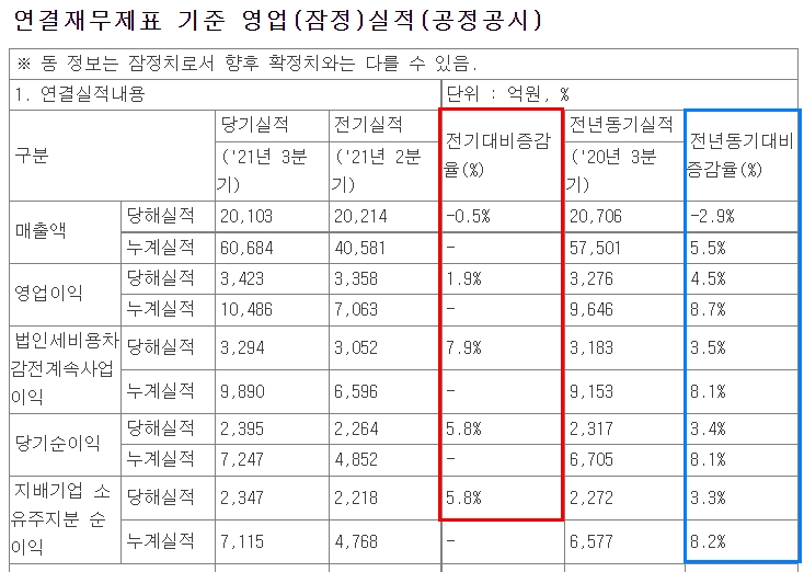실적 공시를 보면, 전기 대비 증감률(%)은 매출은 감소했지만 영업이익, 당기순이익은 올랐음을 확인할 수 있습니다.