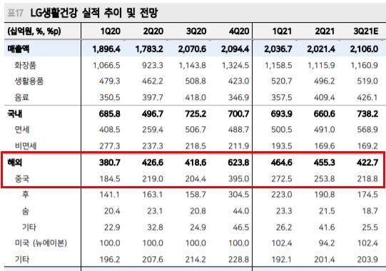 LG생활건강은 작년 광군제로 인해 50% 정도 중국 화장품 매출이 상승한 이후에 꾸준히 감소하고 있는 추세이긴 합니다. 그럼에도 불구하고 전체적인 매출은 조금 떨어지거나 보합 수준입니다.